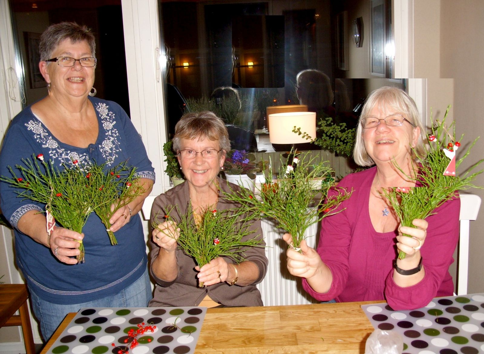Tre Lionsmedlemmar visar upp risbuketter som skall användas vid julmarknaden i Forshälla Bygdegård.Samtliga buketter har försetts med en Rödafjädernsymbol