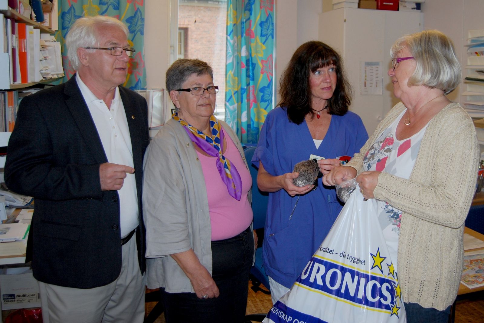 T.h. i bild: Lions Gun Ekström överlämnar 30 st. "Sticke" till Sjuksköterska Lena på Barnmottagningen under överseende av Bert Kronlid och Britt Kronlid också de från Lions Club i Uddevalla.