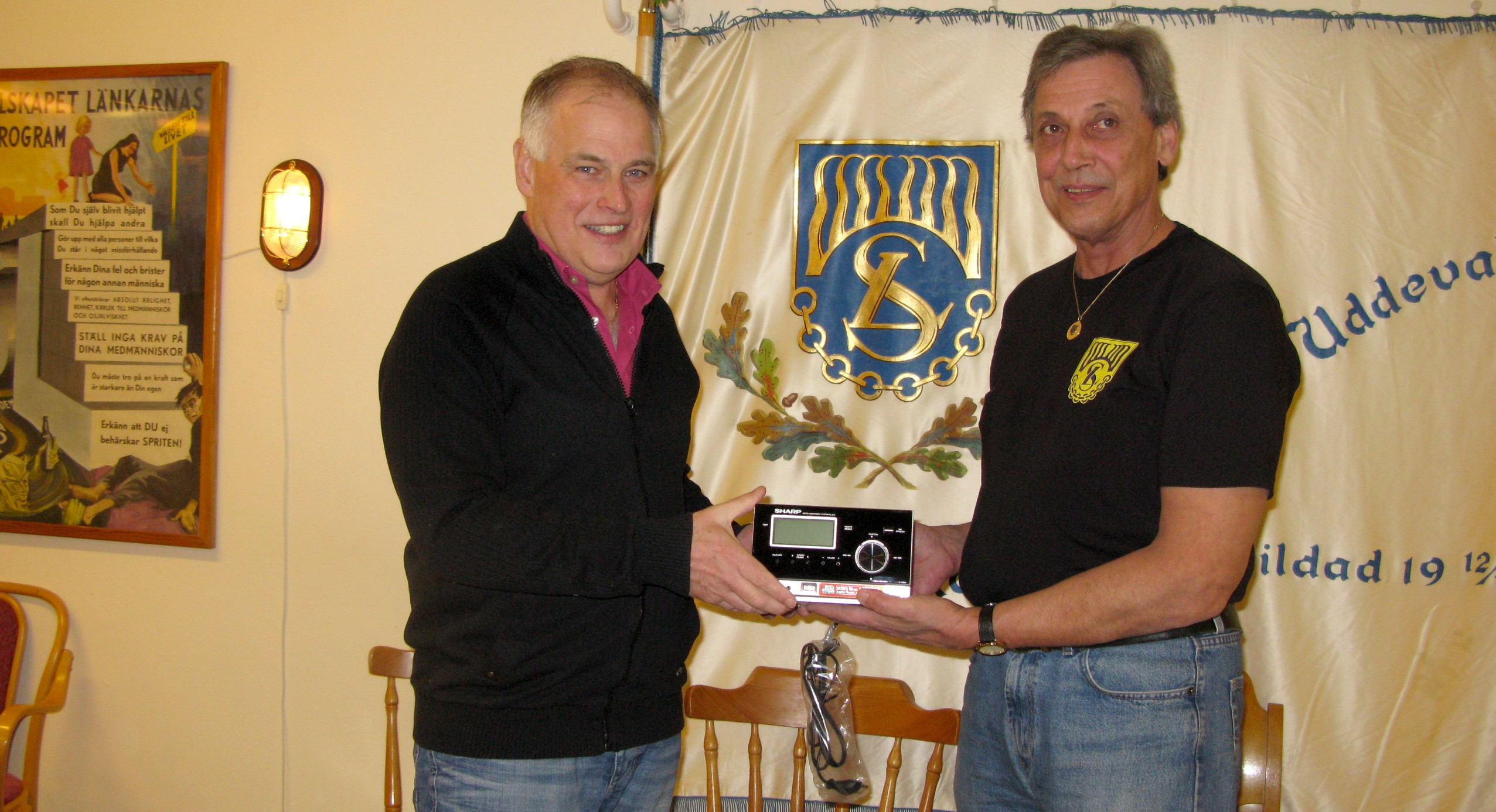 Ordförande i Fria Sällskapet Länkarna Tomas Boo ( t.h.) mottager en CD-spelare från Lions Club Uddevalla. LP Ronny Ekström.( t.v)