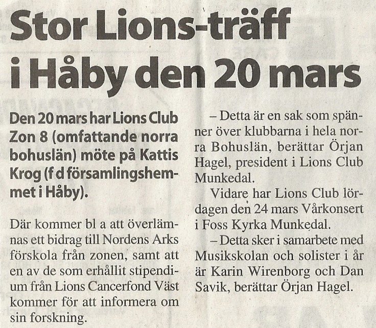 Inför Lions Zonmöte (Zon8) den 20 mars 2012 kunde man läsa